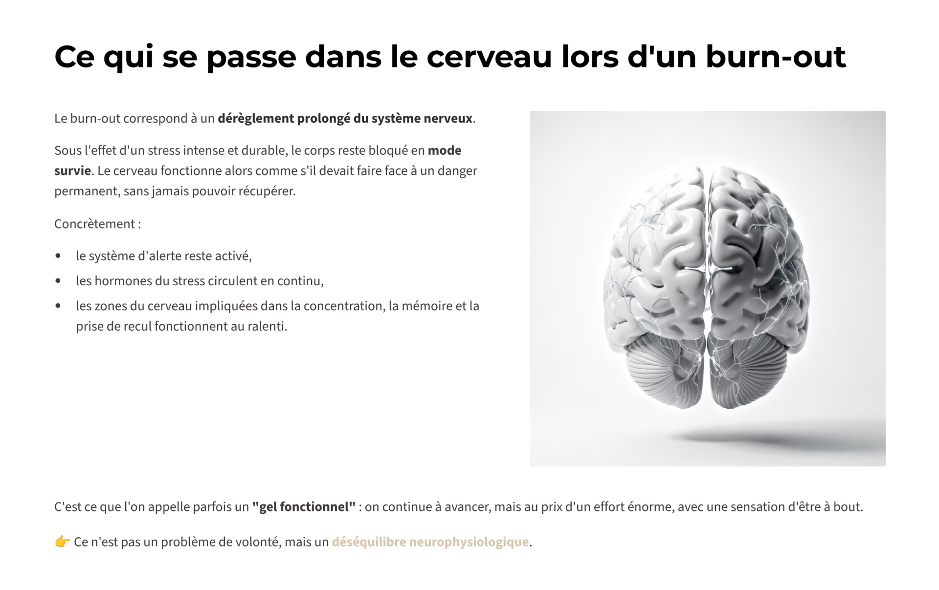 Comprendre et sortir du burn-out est un guide conçu pour éclairer l’épuisement professionnel et ses mécanismes. Il aide à distinguer le burn-out de la dépression et de la fatigue chronique, tout en mettant en lumière le rôle central du système nerveux et la nécessité d’un accompagnement adapté dans le temps.