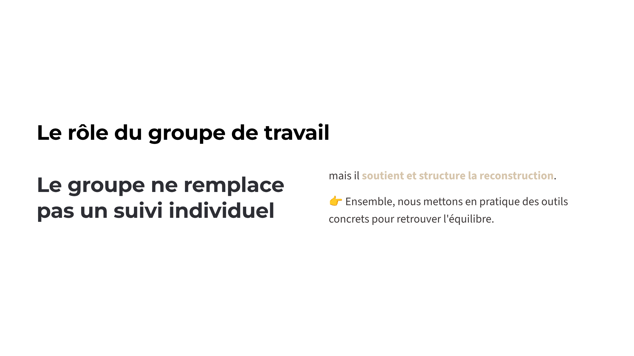 Ce travail de groupe s’adresse à toute personne confrontée à un surmenage professionnel ou émotionnel, à un sentiment de vide ou à une perte de sens dans son quotidien. Il ne s’agit pas seulement de « tenir » à nouveau, mais de comprendre, réparer et reconstruire autrement, à un rythme respectueux de soi.