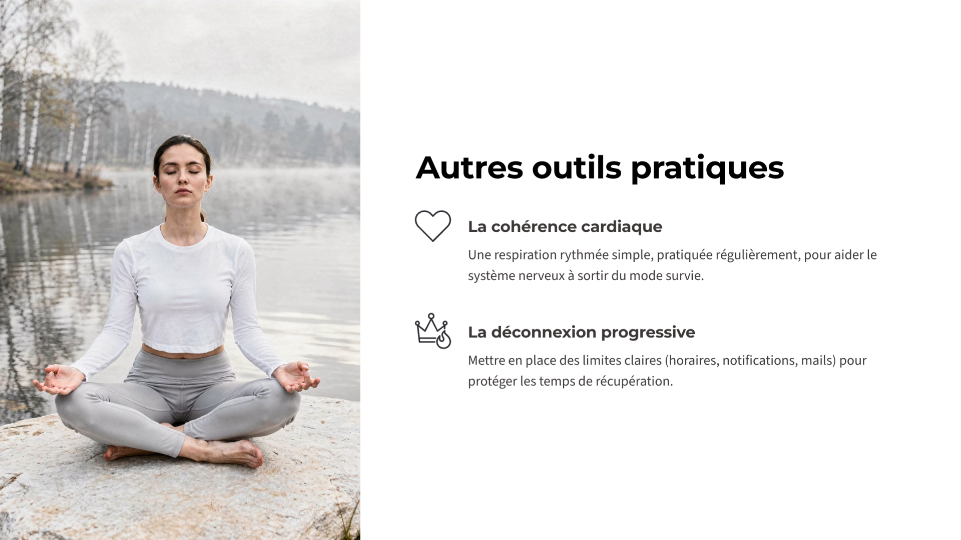 À travers des échanges, des exercices de stabilisation et des outils concrets, chacun peut repérer ses signaux d’alerte, restaurer son énergie et retrouver un équilibre entre engagement et récupération.